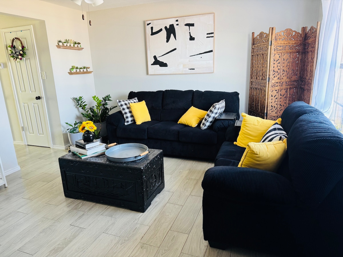¡Experimenta lo último en hospitalidad con todos los servicios que necesitas para sentirte como en casa! La casa adosada cuenta con una hermosa cama tamaño king en el dormitorio principal, sala de estar, cocina totalmente equipada con electrodomésticos de tamaño completo, lavadora/secadora, 2 televisores inteligentes, 2 baños, comedor/estación de trabajo y terraza con asientos al aire libre. Ubicación perfecta para cualquier persona que busque experimentar el valle del Río Grande, ideal para estancias largas. ¡Solo trae tu cepillo de dientes, deshaz la maleta, relájate y pasa un buen rato!