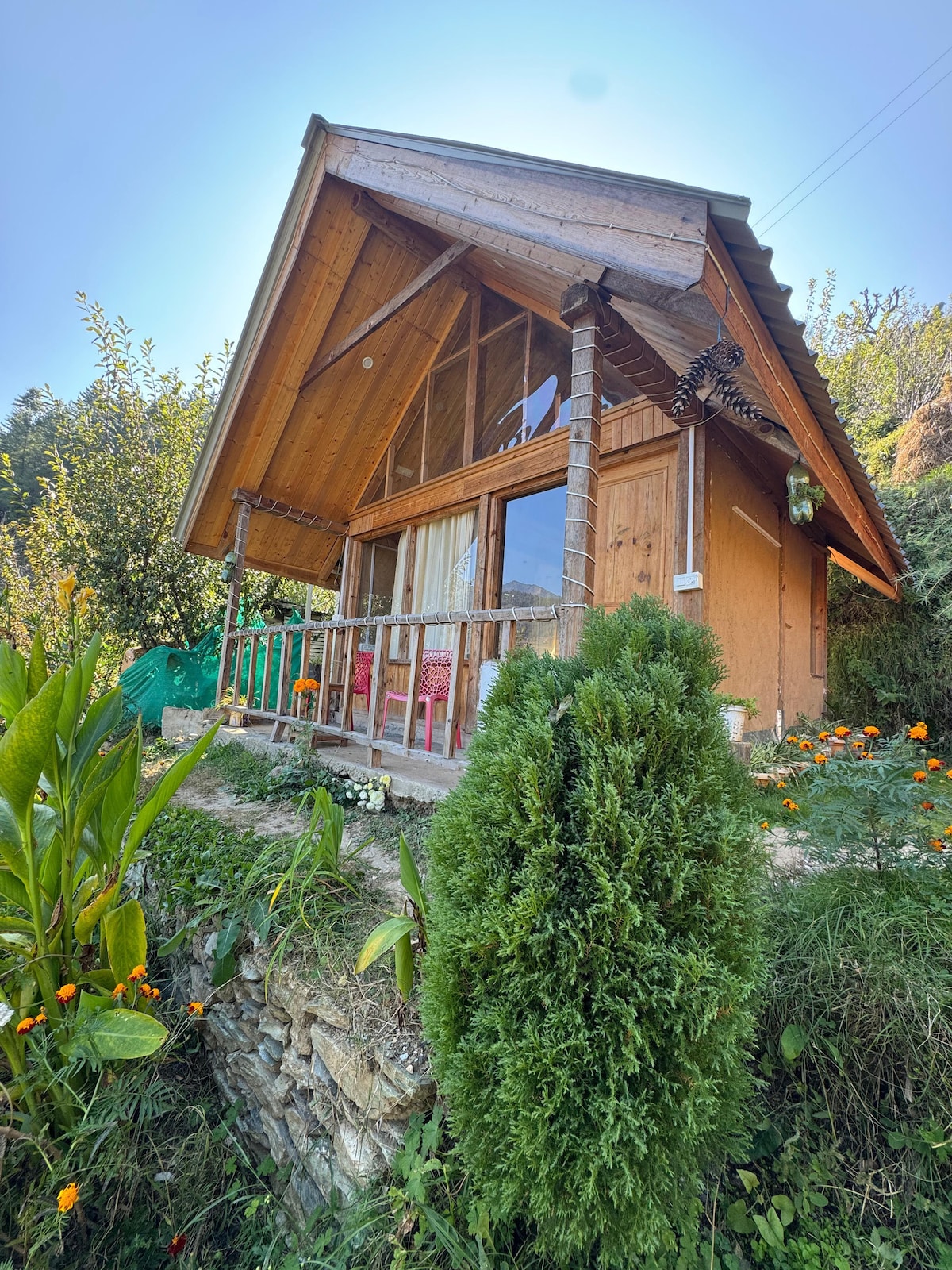 Glamoreo, a solo 1 hora de Shimla. Impresionante interior de madera de nogal, incluidos todos los muebles. Bañera de madera al aire libre, perfecta para sumergirse en el aire fresco de la montaña. La zona circundante es abierta y espaciosa. Puedes caminar, disfrutar de las vistas panorámicas y conocer la vida rural. Todo aquí es orgánico, desde alimentos hasta productos lácteos. Si no te apetecen comidas caseras, hay cafeterías y restaurantes a solo 3–4 km de distancia, y puedes visitarlos o recibir comida a domicilio.