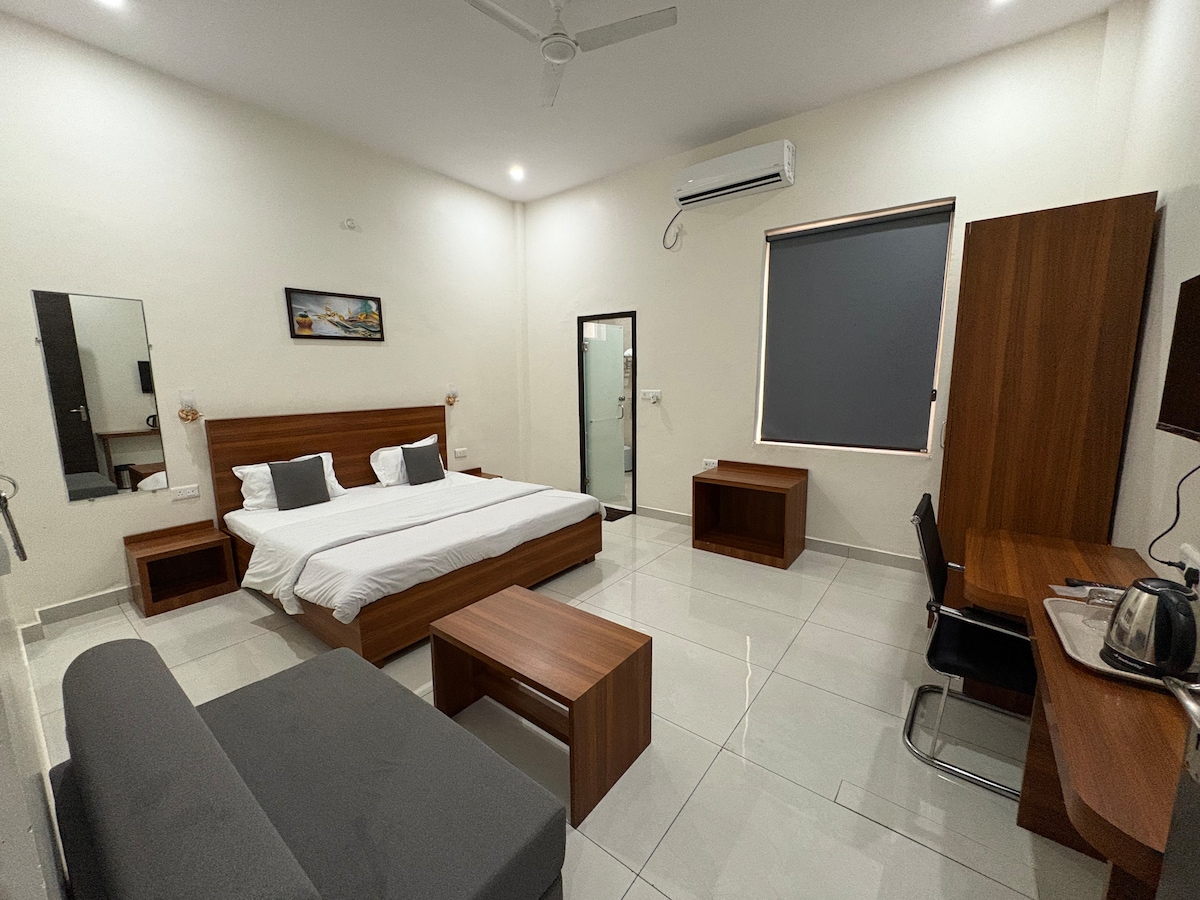 There is -> 1 Bedroom -> AC -> wifi -> tv -> Heater -> Geyser -> fridge -> separate kitchen -> washroom -> Terrace area -> totally private portion with privacy -> Nearby park -> Couple Friendly -> 2 min walking distance to grocery shop -> Location is over National Highway - Just 100 metre inside in Lush green Area