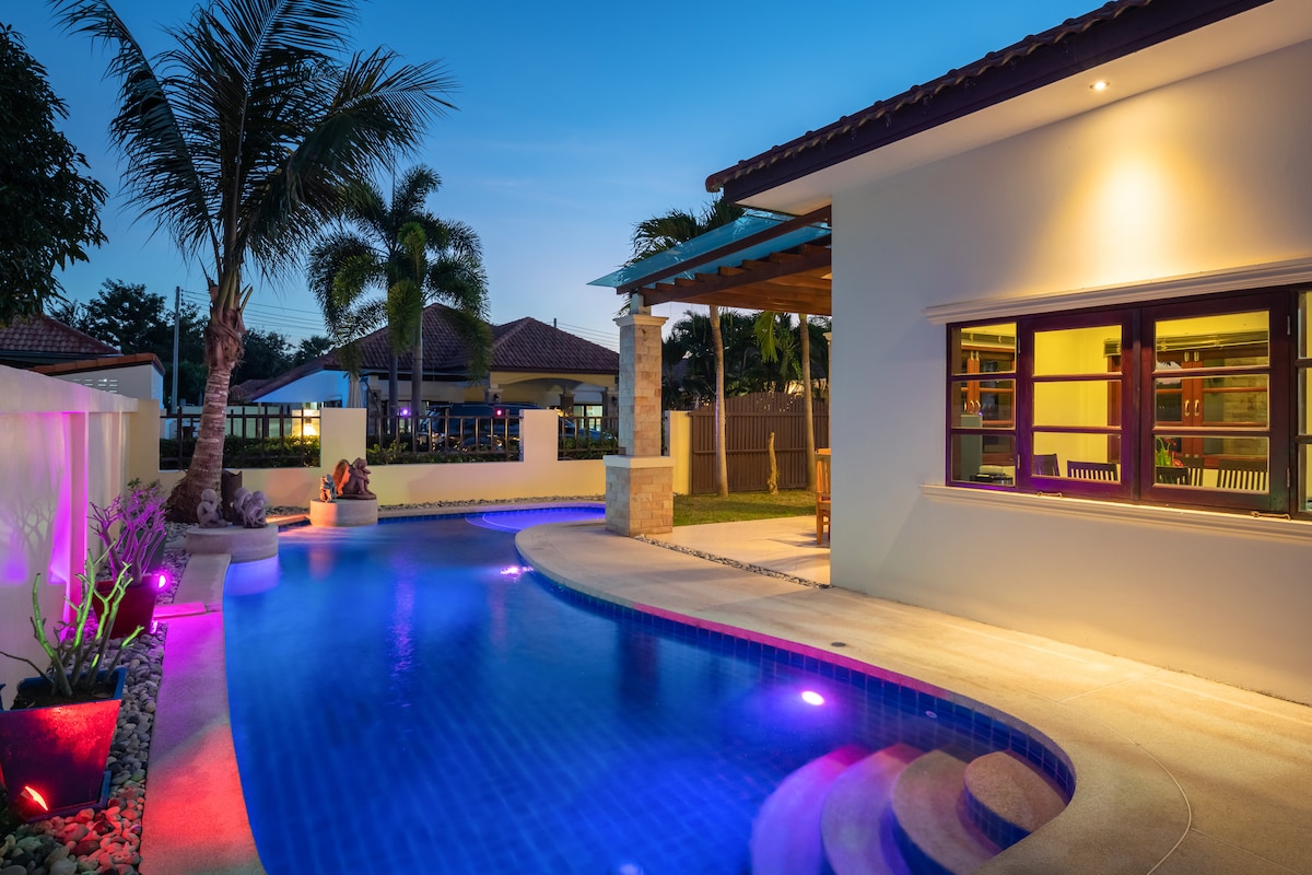 Nota: La entrada al dormitorio principal está separada de la sala de estar y tiene su propia puerta de acceso. Villa completa con piscina privada (área de chorro de jacuzzi en la esquina). - Baño privado con bañera y ducha de efecto lluvia. - Cocina. - 2 tipos de parrilla. - Área en la azotea con vista a la montaña. - 2 plazas de estacionamiento privado. - Sala de estar. Actividades: - A 5 minutos del parque acuático Black Mountain. - A 10 km de la zona central de Hua-Hin (a unos 15 minutos en auto). - A 5 minutos de 7-11 y del mercado nocturno Lunar.