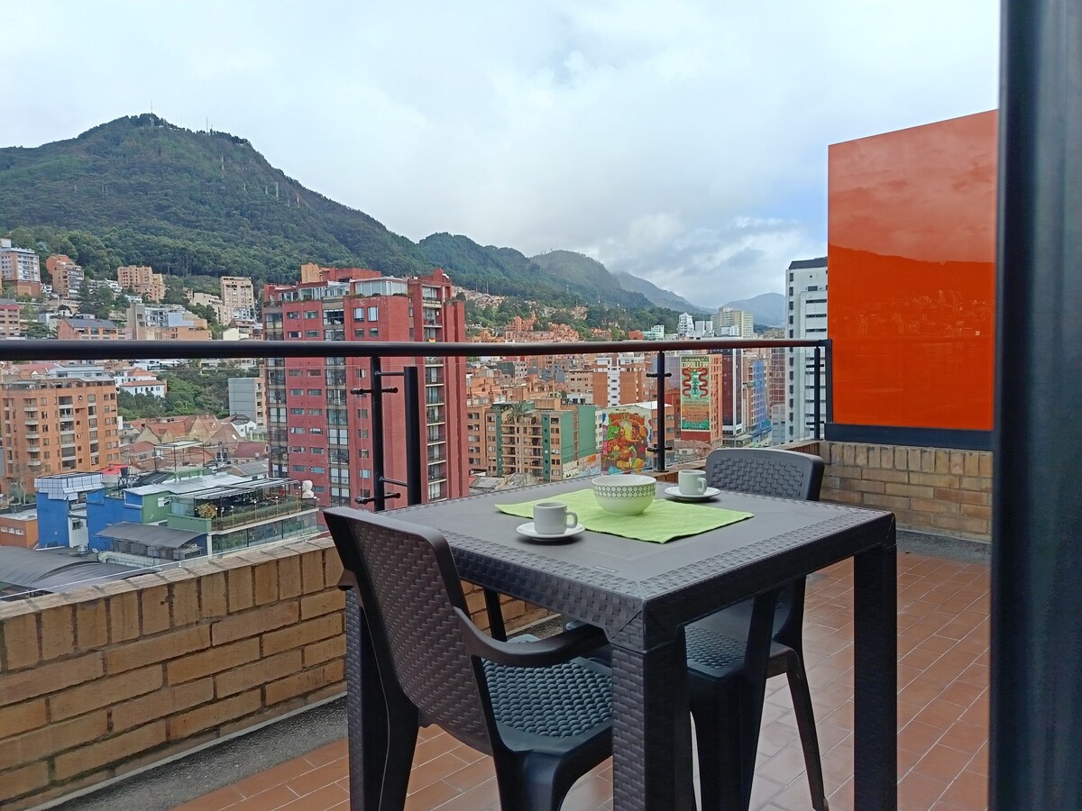 Apartaestudio con amplia terraza, con una vista espectacular a los cerros y a la ciudad, ubicado en el barrio Chapinero junto al parque de los hippies, un sector con restaurantes, bares y discotecas, cerca a la Zona G, al Movistar Arena y a parques con grandes árboles. Es un espacio muy cómodo, tiene cocina y baño equipados con lo necesario para una buena estadía, también cuenta con wifi (500 M), televisión con cable, mat para yoga. El edificio tiene lavandería, co-working, gimnasio.