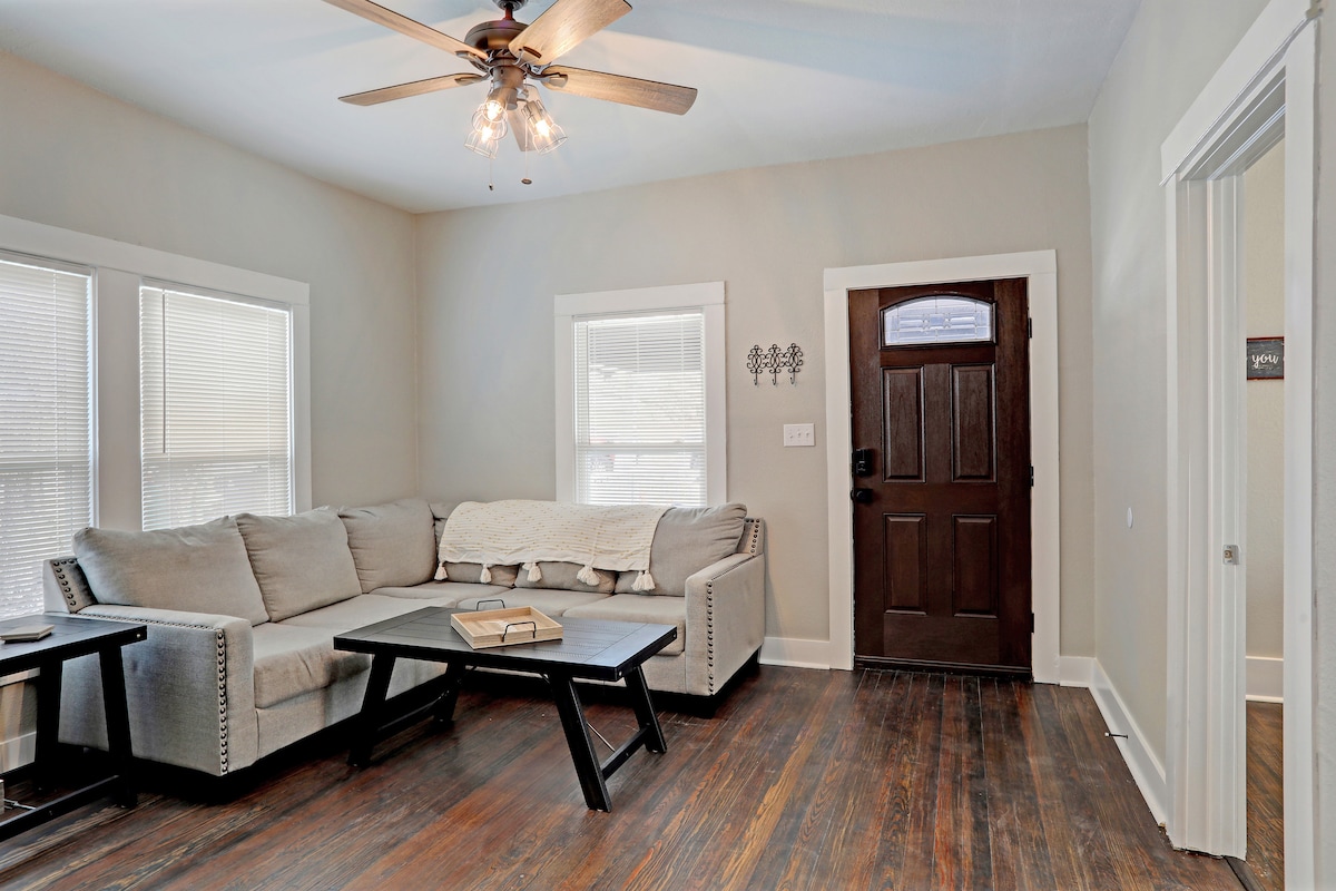 ¡«Favorito de los huéspedes» de AirBnB! ¡A una manzana de uno de los centros históricos más fabulosos de Texas! ¡Un lugar especial y dulce para tu escapada especial! Te encantará esta encantadora casa de campo por muchas razones: la ubicación, por supuesto, pero también te encantarán los detalles que hacen que este lugar sea tan cómodo: 2 camas tamaño king, 1 queen, 1 cama individual + sofá cama, sala de estar cómoda con TV inteligente de 55 pulgadas con wifi, cocina bien equipada, amplio comedor más acogedor rincón de cocina, habitación extra, lavandería y FABULOSOS patios de piedra delanteros y traseros y brasero.