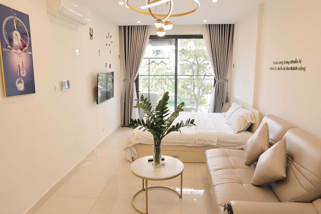 Estudio – Vinhomes Grand Park (vista a la piscina, cerca de Vincom) Disfruta de un cómodo espacio de descanso en un moderno apartamento estudio, aerodinámico pero totalmente equipado: cama con colchón suave, sofá, TV, cocina privada con nevera, estufa, microondas, hervidor y mesa de comedor. El amplio balcón da directamente a la piscina verde, ideal para relajarse después de un largo día.