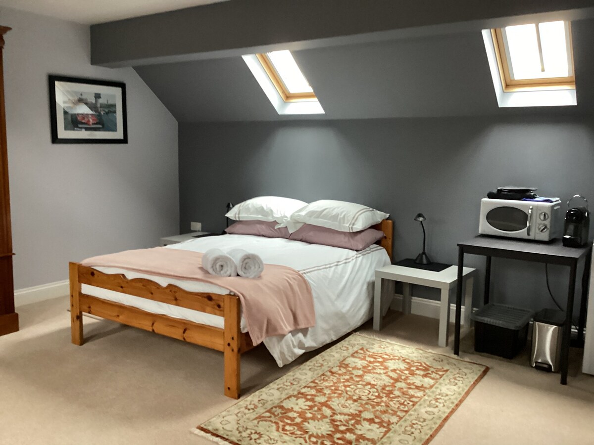 Apartamento privado separado de la casa principal con su propio estacionamiento Ubicado en nuestro jardín privado Cerca de la salida 9, M1 Estamos situados en un carril tranquilo del país, en un ajuste pacífico y con todo dentro de la proximidad corta a la ciudad de Harpenden 5 millas y a las 7 millas de St. Albans. 1 x Cama King Size WIFI GRATUITO TV grande con canales SKY Espacio para colgar el ventilador de techo. COCINA PEQUEÑA con horno, vitrocerámica y nevera Undercounter Hervidor/tostadora de mesa de comedor extensible Utensilios de cocina Ducha/baño Secador de pelo Estacionamiento