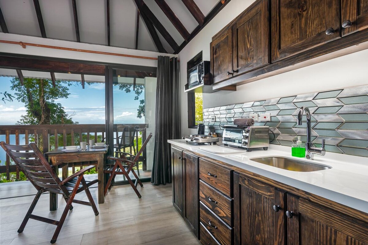 Disfruta del canto de los pájaros y del susurro del viento entre las hojas de un árbol de nuez moscada centenario en esta acogedora casa del árbol. Rodeada de árboles con impresionantes vistas al bosque circundante, montañas exuberantes y el mar Caribe, esta casa del árbol de madera y vidrio es un gran espacio para escapar del ajetreo de la vida urbana. Accede a través de una corta caminata, pero al llegar relájate y disfruta de la tranquilidad, la comodidad y las comodidades modernas mientras te sumerges en la belleza cruda de la naturaleza.