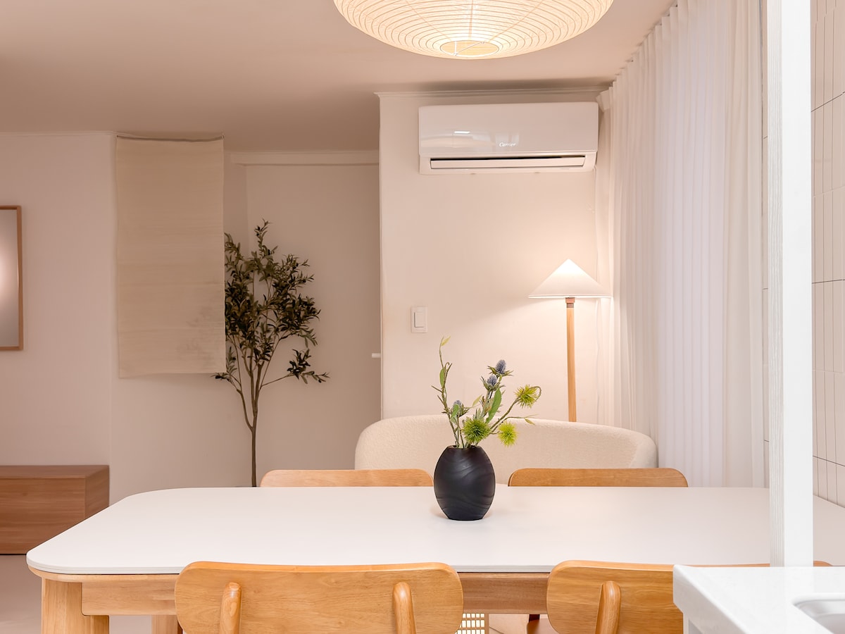 Hola, Recientemente, este alojamiento completó todo el interior. Es una casa adosada acogedora y hermosa. (¡Interior completado en octubre de 2024!) Se tarda unos 7-8 minutos a pie desde la salida 1 de la estación universitaria de Hongik. La parada de autobús del aeropuerto también está cerca. La sala de estar está bien iluminada, También hay una terraza exterior donde puedes relajarte. Hay una mesa para 8 personas y un sofá de tela de ganso. Las camas están equipadas con ropa de cama de estilo hotelero y colchones de alta calidad. Dormitorio1- Cama tamaño queen + queen Habitación 2- Queen + Queen < Características del anuncio > * ¡Estacionamiento gratuito disponible! * Se proporciona una caja de almacenamiento de equipaje gratuita. * Artículos en la casa - Lavadora y secadora - Refrigerador. - 2 secadores de pelo. - Plancha de vapor. - Cocina de infrarrojos - Microondas y nevera. - Aire acondicionado en cada habitación. - calefacción por suelo radiante - Televisor inteligente de 65 pulgadas. - Se puede proporcionar silla para bebés, bañera para bebés y cubiertos para bebés a pedido. - ¡Totalmente equipado con varios electrodomésticos, platos y utensilios de cocina! - No se admiten perros.