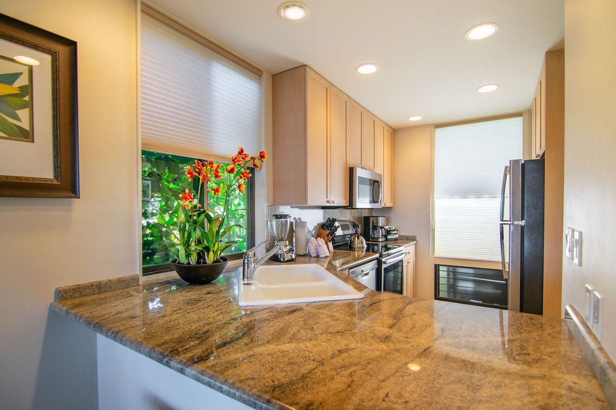 Camina por la playa y la arena desde nuestro complejo. Disfruta de las puestas de sol en nuestro Lanai. El condominio incluye todo lo que necesitarás (cocina totalmente equipada con estufa, refrigerador, microondas, cafetera, etc.). Cama tamaño king, TV de pantalla plana, conexión Wi-Fi gratuita. Encimeras de granito en cocina y baño. ¡Aire acondicionado gratuito!