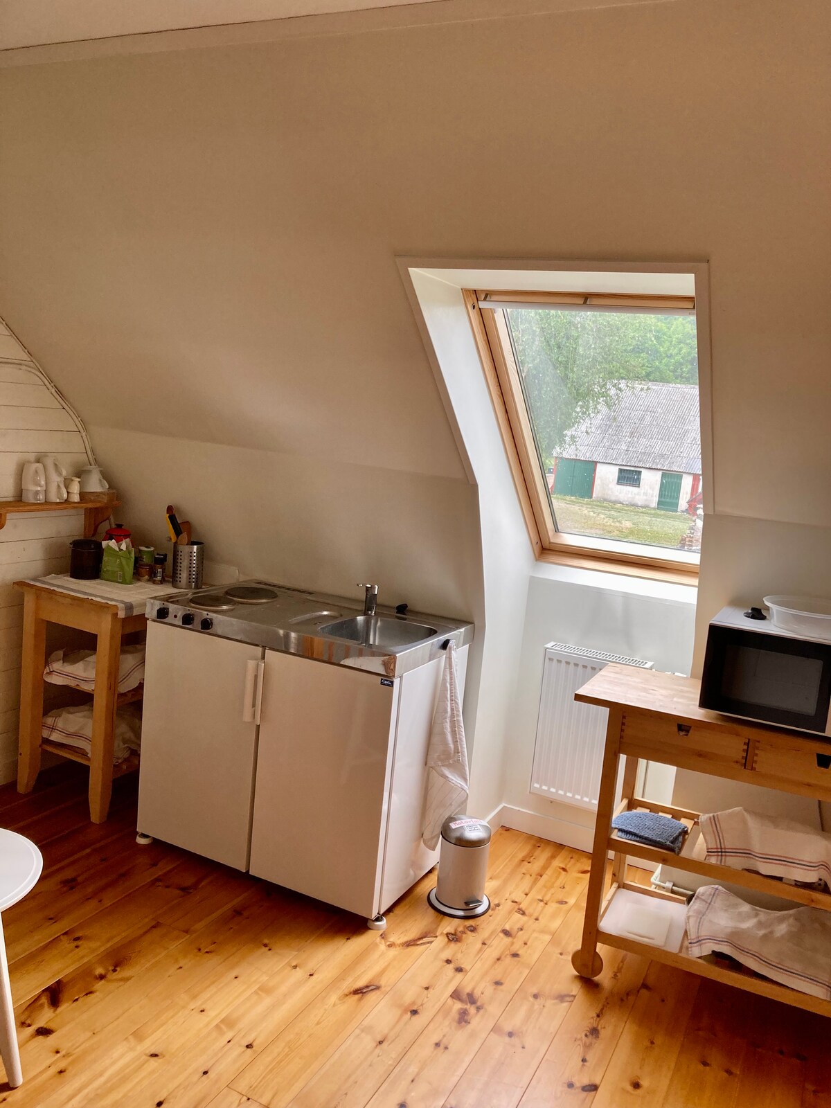 Al final de un camino de grava sinuoso se encuentra este alojamiento. Es una granja con una casa de campo. La naturaleza está a la vuelta de la esquina y hay muchos paseos maravillosos cerca. El alojamiento tiene una cocina con dos placas y un frigorífico con un pequeño congelador. También hay microondas, hervidor de agua y cafetera. Hay una cuna disponible y también bicicletas para alquilar. El apartamento está en el segundo piso de una casa y las escaleras son estrechas y un poco empinadas. Si tiene alguna petición, ¡pregunte y lo resolveremos!