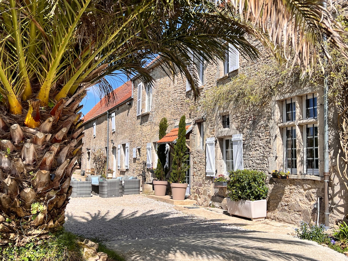 Estaremos encantados de recibirla en nuestra mansión que restauramos con amor . Entrada independiente, ocupará todo el ala izquierda . Vivimos en el ala derecha .Jardín con piscina climatizada en temporada y parque arbolado con gallinas y conejillos de indias en libertad . Billar . Ping pong . Ático equipado con bar y dardos de bádminton .wifi de campo! . 2 km VALOGNES ciudad restaurante tiendas cine centro acuático 10 min playas del desembarque .table de anfitrión con reserva