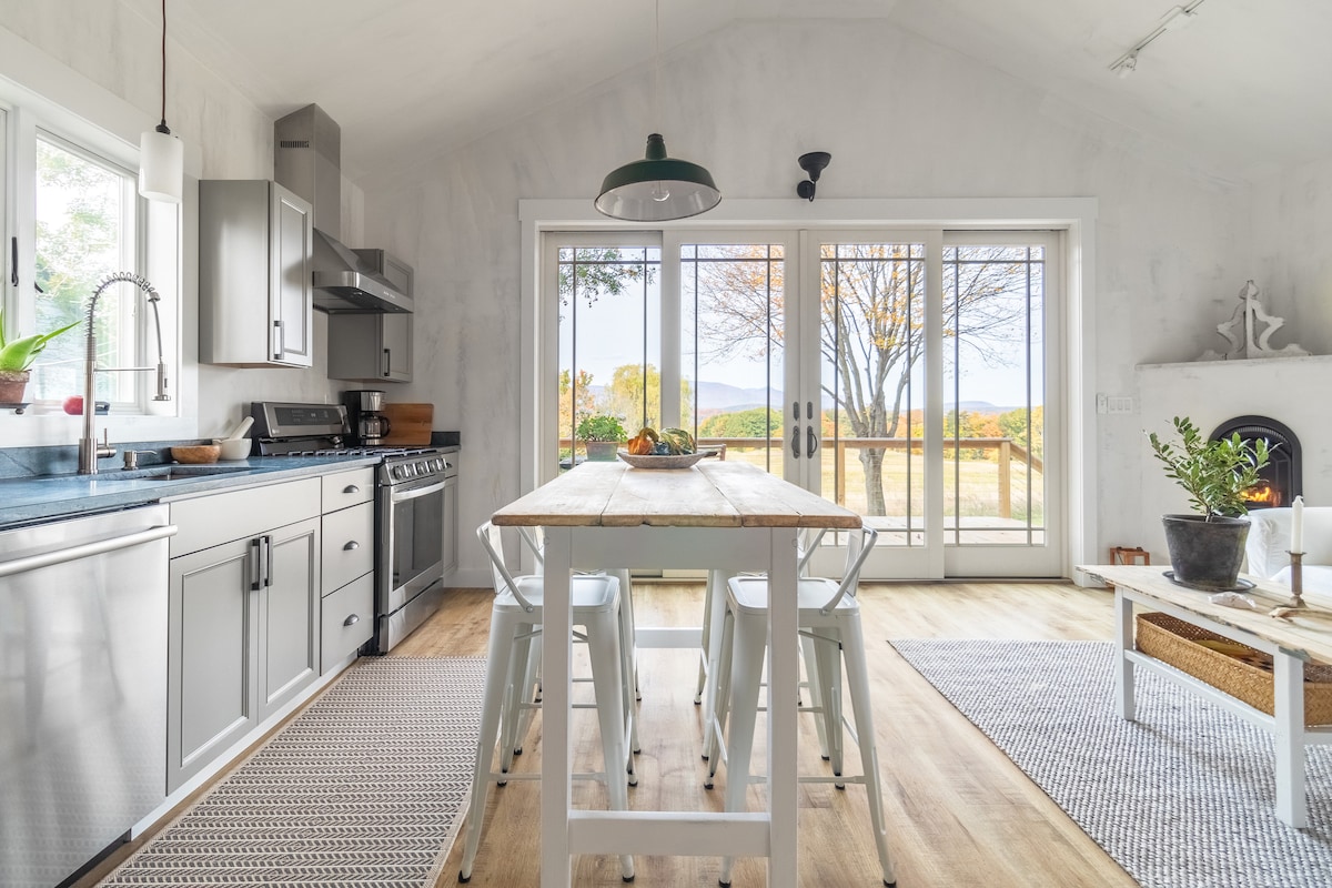 Una cabaña moderna única con impresionantes vistas/Un baño tipo spa/Chimenea de gas/Cocina de chef totalmente equipada/Encimeras de esteatita/Nuevos electrodomésticos premium. Privacidad total Techos altos, paredes enyesadas a mano, puertas antiguas. Las puertas francesas de vidrio se abren hacia una terraza privada Disfruta de la gran montaña Catskill y de las vistas de temporada del río Hudson. La bañera grande tiene una ducha con puerta de vidrio con azulejos y una bañera de inmersión. ¡Un fogón de Fieldstone tiene vistas a los Catskills!