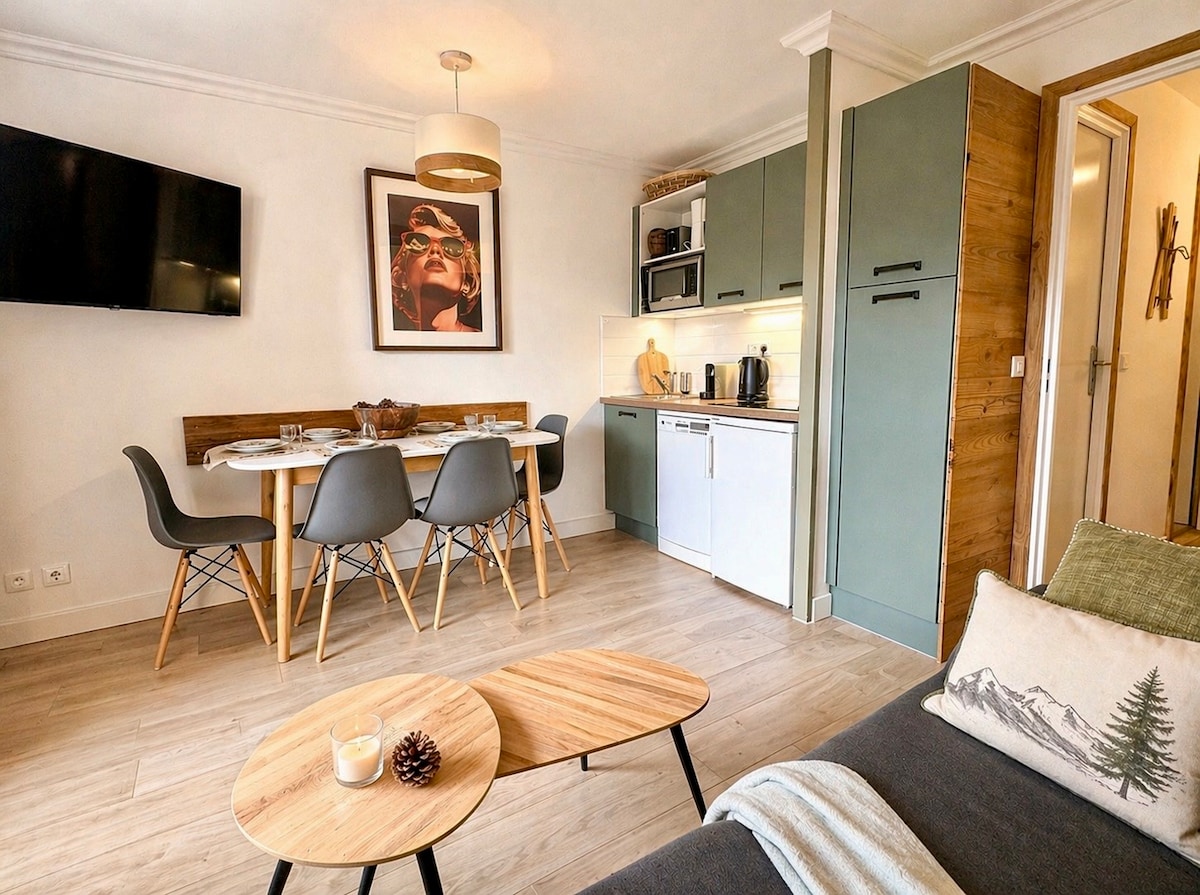 Disfruta de un alojamiento elegante y céntrico. - 4 camas: 1 cama doble clic-clac, 2 camas individuales superpuestas. -Cocina equipada (placa de inducción 2 fuegos, campana extractora, horno combinado microondas, cafetera Dolce Gusto, cafetera de filtro, tostadora, hervidor de agua, raclette y fondue, crepera) - Gran habitación con 1 armario, 1 mesa , 3 sillas altas, 2 taburetes, 1 TV - Baño con 1 lavadora, 1 radiador, 1 secador de pelo. -WC separado
