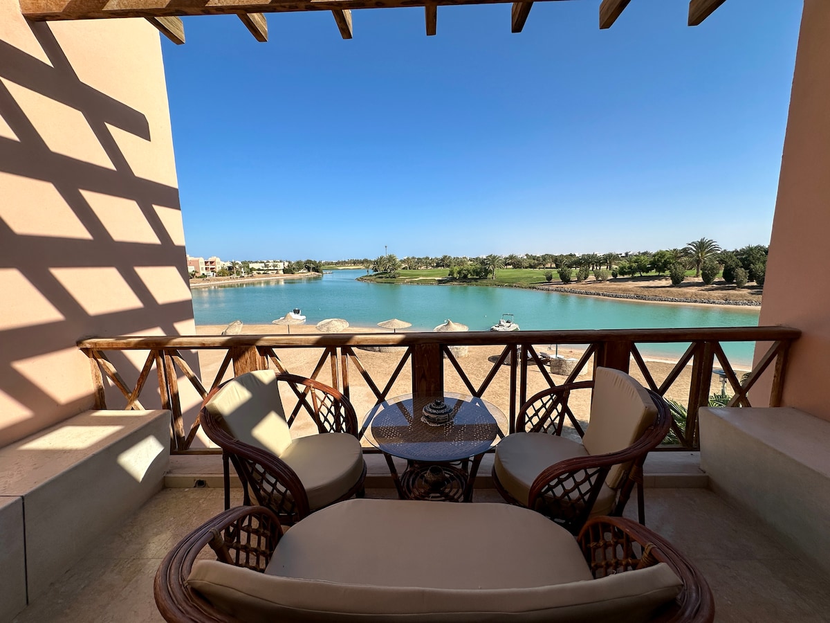 El acogedor apartamento de dos dormitorios en la segunda planta ofrece una maravillosa vista de la laguna marina más grande de El Gouna, con un hermoso paisaje y campos de golf . Tanto la laguna como el golf son convenientemente accesibles. Además, ¡puedes disfrutar de una estancia completamente privada en el balcón! El departamento está ubicado en el vecindario 'Golf Steigenberger', cerca de la animada zona del centro a 3 minutos y Abu Tig Marina a 5 minutos , pero lo suficientemente lejos de la multitud y el ruido.