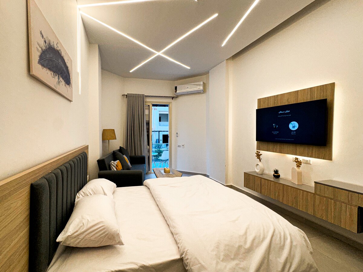 Acogedor estudio amueblado en Florenza Khamsin, Hurghada Lo que te encantará: ✔ Totalmente amueblado con una cómoda cama, zona de estar, microondas, wifi gratuito y TV inteligente ✔ Cocina pequeña bien equipada para comidas caseras ✔ Scandic Beach está a 250 m de distancia, 300 egp/día para una persona Balcón ✔ privado para disfrutar de la brisa de aire fresco. ✔ Acceso a 3 piscinas dentro del complejo. Seguridad y recepción ✔ las 24 horas, los 7 días de la semana, para una estadía sin preocupaciones