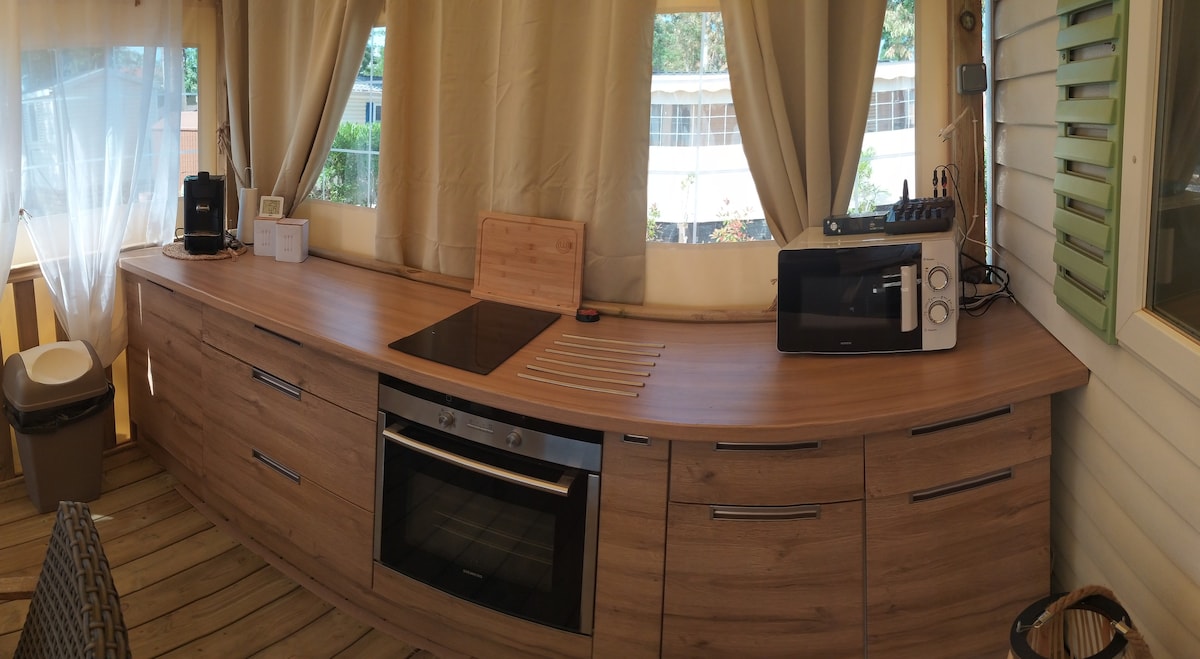 Alquiler Mobile Home de 32 m² con aire acondicionado y una terraza de 32 m² en una parcela de 220 m² en Hyères en el Camping les Pins Maritimes a 200 m de la playa El Mobile Home consta de una sala de estar con un sofá esquinero, TV de pantalla plana, reproductor de DVD, mesa y 4 sillas, una cocina equipada ( gran nevera congelador, microondas, horno, tostadora, cafetera, hervidor de agua), un baño con ducha, inodoro separado, un dormitorio con una cama de 140 y un segundo dormitorio con 2 camas de 80.