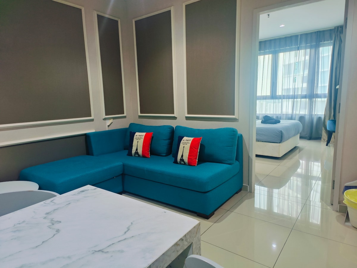 Este espacioso apartamento es perfecto para unas grandes vacaciones familiares. Puede atender hasta 8 personas, con un pase de estacionamiento gratuito, wifi y televisores inteligentes listos para Netflix para disfrutar. Las instalaciones incluyen una gran piscina, completa con sauna y gimnasio. Lugar muy estratégico, ubicado junto al parque temático i-City y conectado a través de skybridge al Central i-City Mall, el centro comercial más grande de Shah Alam con marcas globales, supermercados, cines, restaurantes y cafeterías que traen una emocionante experiencia de compras.
