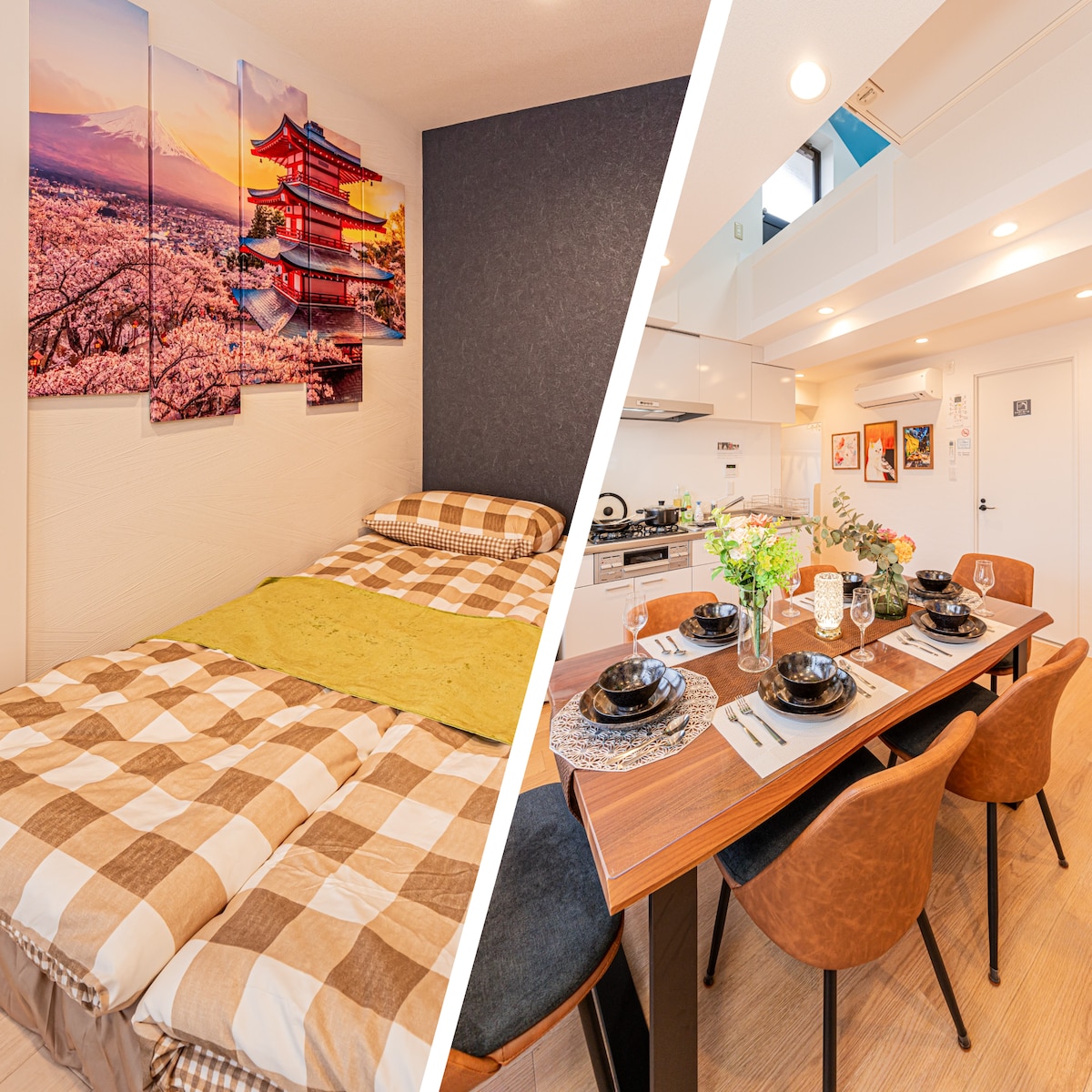 A solo 2 minutos a pie de la estación, Palette House es un refugio acogedor y elegante perfecto para explorar Tokio. La cocina de estilo industrial incluye una barra de isla, utensilios de cocina completos, copas de vino y un dispensador de agua, ideal para cocinar y tomar bebidas por la noche. La sala de estar cuenta con una decoración de madera flotante natural y un cómodo sofá, mientras que el dormitorio moderno japonés ofrece un espacio refinado y relajante. Con comodidades bien pensadas y un diseño cálido, es una base perfecta para parejas y familias.