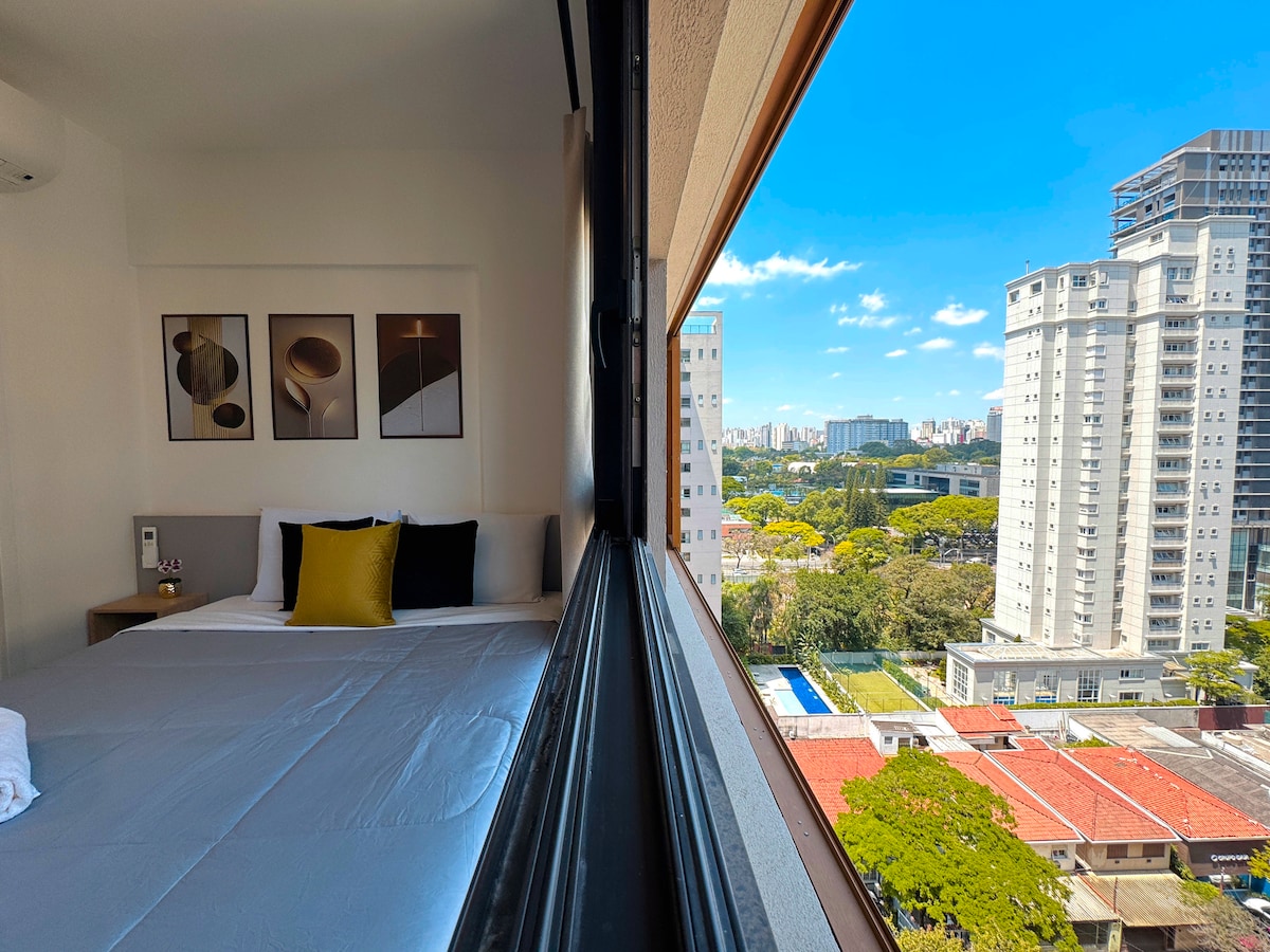 Nuevo estudio con vistas espectaculares, en Itaim cerca del parque Ibirapuera. Experiencia única > wifi DE alta velocidad > vista panorámica > TV inteligente de 43pulgadas con acceso a Internet > cerradura electrónica > Cama doble doble tamaño Queen > persiana black out > aire acondicionado frío y caliente > cocina completa > nespresso Gran zona > Rua Joaquim Floriano, 153, junto a JK A 1 km del parque Ibirapuera Condominio > lavandería con lava y seca > Gimnasio > piscina en la azotea > coworking > conserje las 24 horas, los 7 días