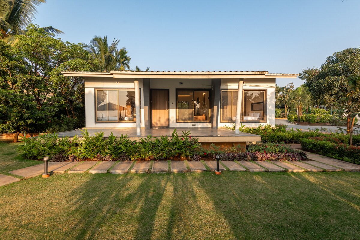 Una elegante villa con piscina de hidromasaje Semi Indoor (150 pies cuadrados, profundidad es de 2,5 pies) y una enorme terraza. La villa Tulip es una villa de 3000 pies cuadrados rodeada de hermosos jardines en un terreno de 0,5 acres que proporciona una experiencia de naturaleza serena. Esta villa se encuentra en Grape County Eco Resort, a poca distancia del restaurante y el lago del GC Resort. La villa está construida con estándares y comodidades que cumplen con la hospitalidad premium. Distancia en coche de: - Trimbakeshwar Mandir: 15 minutos. - Viñedo Sula: 22 minutos.