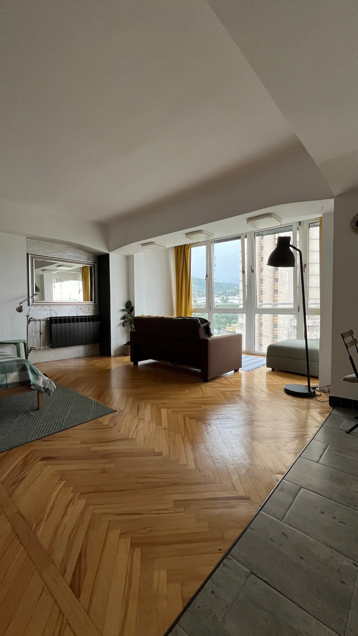 ¡Apartamento único en Arbat en el piso 11 con balcón con vista a la montaña! Edificio posmodernista de 1984 en la encrucijada de las principales calles peatonales Panfilov/Zhibek Zholy. Rodeado de restaurantes, cafeterías, el centro comercial Passage, TsUM y cines. Cerca de lugares históricos: baños Arasan, Bazar Verde, Catedral de la Ascensión, Parque Central. A 2 minutos a pie del metro. ¡Perfecto para que los viajeros exploren la ubicación histórica del centro de la ciudad!