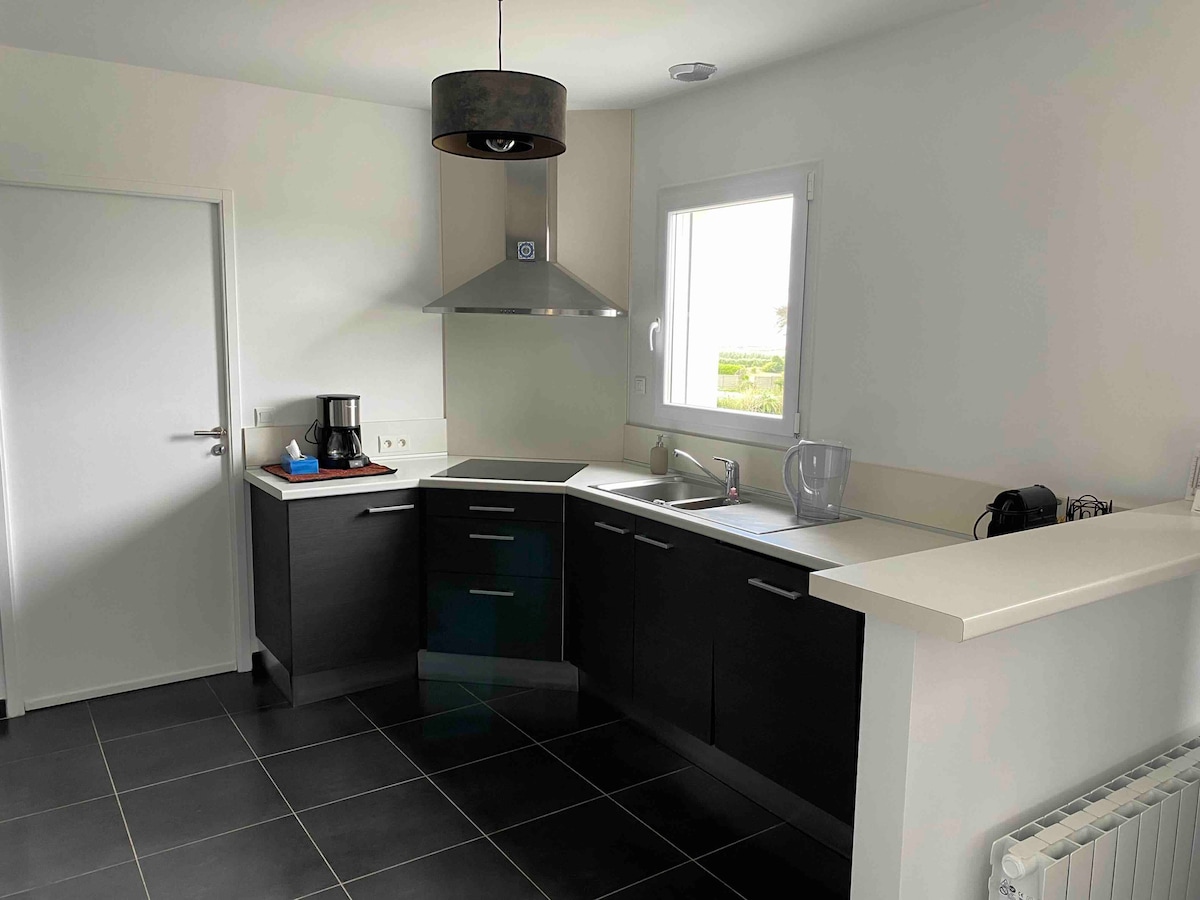 Simplifíquese la vida en este alojamiento tranquilo y céntrico. Casa reformada con el espíritu de las Cícladas como un nido luminoso. Gran sala de estar de 30 m2 con salón comedor cocina que da a una terraza para comidas al sol. Una estufa completa esta habitación para calentar los pocos días de lluvia que nunca duran. Arriba, una pequeña escalera conduce a 2 dormitorios con un baño con ducha en el centro. 1 dormitorio principal con cama de 160 cm x 200 cm 1 habitación para niños 2 camas de 90 x 200. La serenidad.