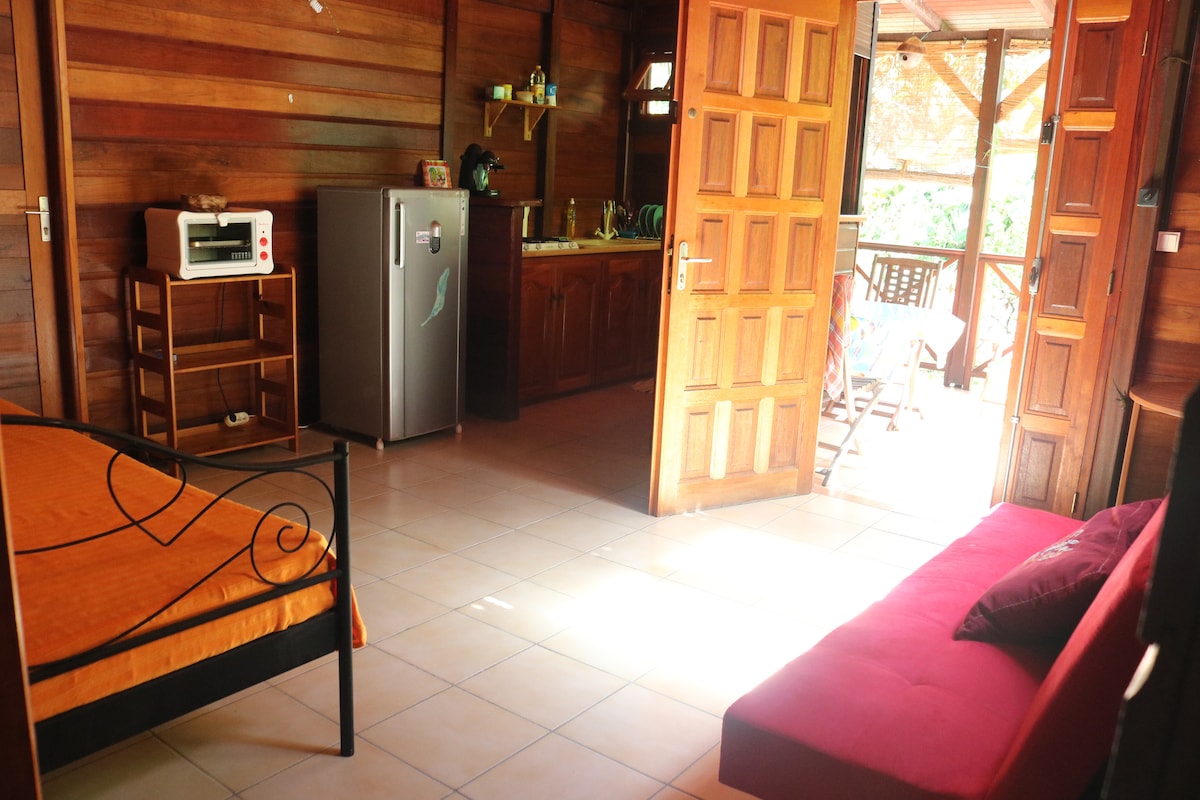 Bungalow con encanto para 2 personas situado en una zona tranquila en el jardín de una propiedad. Una habitación de 20 m2 con aire acondicionado, cama de 160 cm, baño con ducha e inodoro, cocina equipada en la terraza, wifi. A 5 minutos de Basse-terre y de la Soufrière ,comercios cercanos.