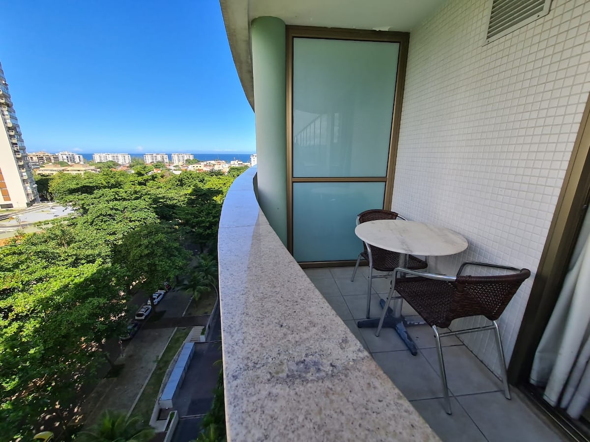 Lindo Flat con despensa y balcón con vista al mar. (Totalmente independiente) Excelente ubicación en el corazón de Barra da Tijuca, cerca de los mejores centros comerciales, bares, restaurantes y la playa de Barra da Tijuca (acceso a pie entre las estaciones 5 y 6). El apartamento tiene almacenamiento de dos a tres veces a la semana, Internet, Streaming, agua caliente, aire acondicionado y Garage Wave incluidos. Los visitantes están prohibidos. *Eventos cercanos Nochevieja en Barra da Tijuca, Carnaval en Río de Janeiro, Río Centro y UFC.