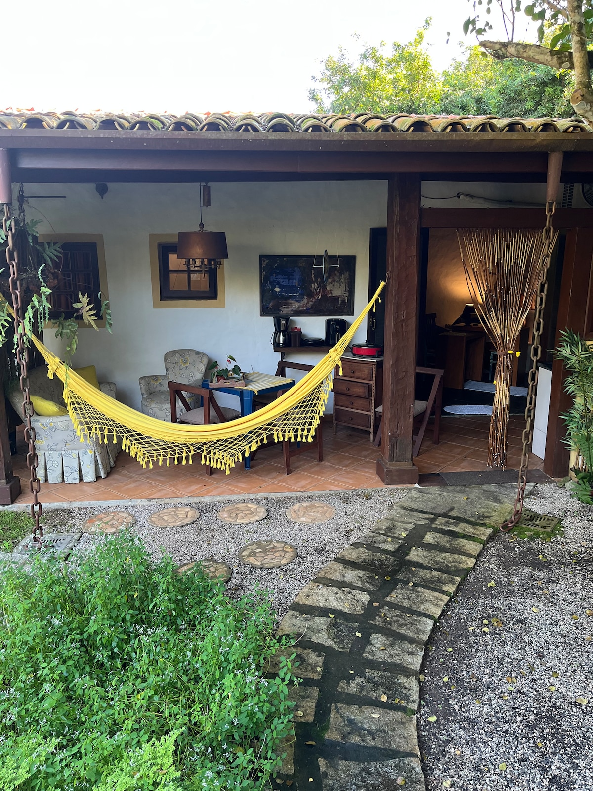 Un bungalow construido artísticamente en cada detalle... bañera abierta al bosque con techo de cristal dan la sensación de estar inmerso en la naturaleza, con una higuera centenaria al frente y muchas aves... íntimo y acogedor en conexión con la Naturaleza en contacto con esta zona de reserva de la Mata Atlántica. La otra ducha de hidromasaje está en la terraza abierta al bosque y es deliciosa de día o de noche con cielo estrellado y luna.