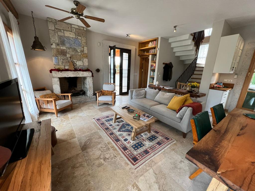 Esmir/Cesme - Ubicado en 350 m2 de terreno, - Villa adosada : 2 pisos(dúplex). - Piscina privada: 55–60 toneladas / Piscina climatizada - Piso bajo: 1 sala de estar, 1 cocina, 1 inodoro, 1 terraza de la piscina. - Piso superior: 1 dormitorio(con baño privado), 2 dormitorios, 1 baño+inodoro, 1 balcón. - Calefacción : aire acondicionado. - Cuartel: Habitaciones de madera. - Características : agua de pozo artesanal, estacionamiento privado (electricidad,agua, WİFİ, mantenimiento del jardín y la piscina,impuestos no incluidos).