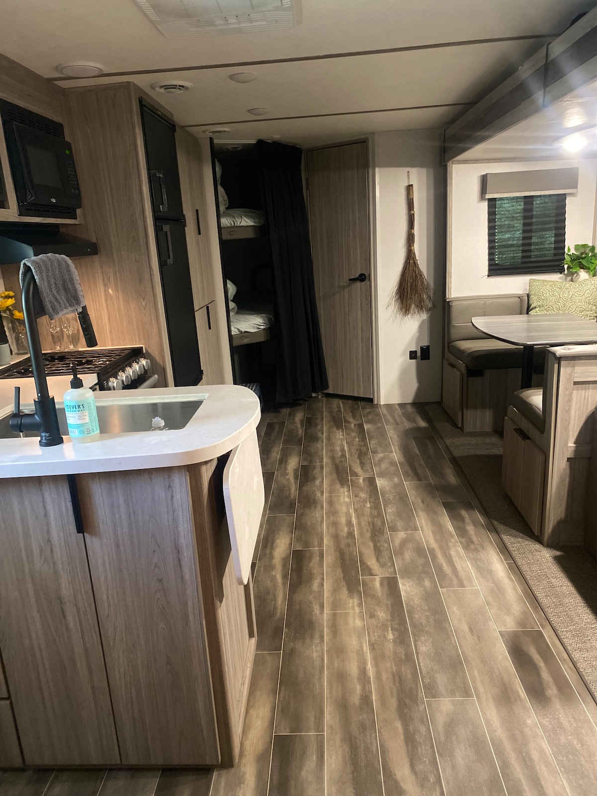 Solo tienes que presentarte y divertirte en el camping sin configuración en nuestra nueva autocaravana. A 5-10 minutos de la I 57/70 y Effingham, cientos de restaurantes, bodegas, rutas de ciclismo. Hermoso nuevo Keystone Passport Grand Touring 27' Camper configurado para 4 estaciones de vida con tobogán, cocina al aire libre, parrilla, toldo automático, baño con bañera/ducha, cocina abierta, literas dobles, dormitorio principal queen afuera en 10 acres de bosques y senderos en una pequeña ciudad tranquila. Extremadamente limpio. Chimenea con sillas.