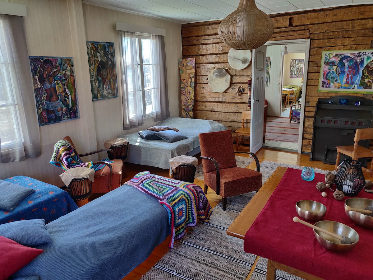 Te invitamos a alojarte en una espaciosa casa unifamiliar junto al río, en las inmediaciones de la playa de ópera. En el interior, hay la oportunidad de estar solo, así como de pasar tiempo juntos. El jardín es grande y muy exuberante y hermoso en verano, con grandes árboles y plantas coloridas. También tienes un sauna en el patio. Durante tu estancia, puedes caminar (unos 10 minutos) hasta el centro de Ilmajoki. El salón, la biblioteca y los museos de Ilmajoki están casi al lado. Puedes conducir hasta el Seinäjoki en unos 20 minutos.