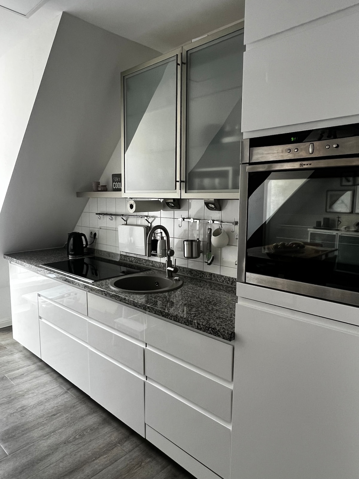 El departamento está en la planta baja y tiene capacidad para 2 personas. El baño está equipado con una ducha grande y baja, cabina de infrarrojos y calefacción por suelo radiante. La cocina está totalmente equipada con cafetera, tostadora, hervidor de agua. La lavadora-secadora también está integrada en esto. Los techos altos y los grandes ventanales dan una gran sensación de espacio, que está subrayada por las modernas lámparas LED. Atenúa las habitaciones o ajusta la temperatura de la luz como desees.