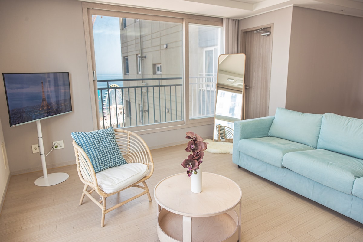A space suitable for families staying in the heart of Sokcho. 1 minute walk Make special memories while traveling to the beautiful ocean and Sokcho. (Half Ocean View)