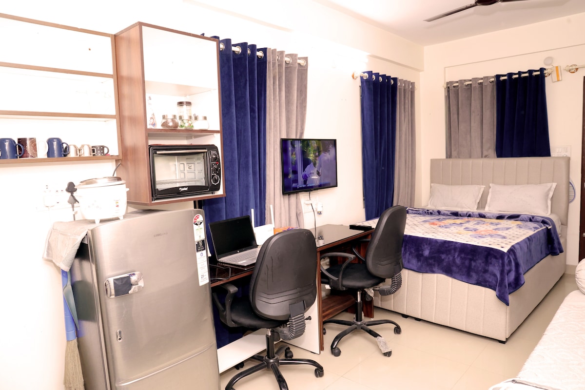 Amplia suite 1BHK de diseño de 600 pies cuadrados con balcón privado | Wifi de fibra óptica de alta velocidad y TV inteligente con plataformas de streaming, escritorio de trabajo/comedor, respaldo de energía las 24 horas, los 7 días de la semana para trabajo y comodidad ininterrumpidos | Cama tamaño king Luxe y colchón ortopédico, armarios de madera para almacenamiento | Cocina pequeña totalmente equipada | Sofá cama en la sala de estar , ocupación máxima 4 | Acceso al ascensor, servicio de limpieza profesional y acceso a lavandería de pago en el sitio para estancias largas | Ubicado en el centro de Bangalore | LGBTQIA++ Afirmativo