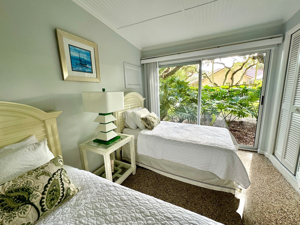 This Tennis Villa is in a lush tropical setting desirably located between the Atlantic Ocean and Intra-coastal waterway within a private, gated community known as Sea Oaks. This luxurious one bedroom, 2 full bath villa has French doors opening to a large lanai overlooking a tropical garden of live oak and palm trees. Sea Oaks is a 5 Star Tennis & Beach community with 16 beautifully maintained har-tru tennis courts. Our Beach Club offers fine dining and an oceanfront gazebo bar.