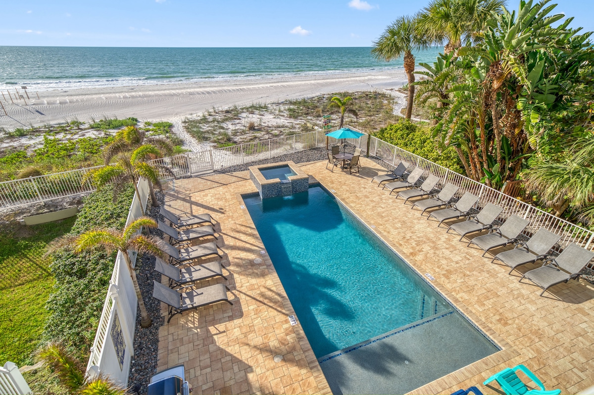 Departamento impresionante frente a la playa en playa privada RECIÉN RENOVADO. ¡A poca distancia a pie de bares, restaurantes, música en vivo y más! Cama tamaño king nueva, wifi de alta velocidad, televisores inteligentes con cable/Netflix, piscina climatizada, barbacoa/parrillas, mesas al aire libre, duchas, balcón frente a la playa, espacio de trabajo y ¡estás JUSTO en la playa! ¡A poca distancia en auto de los aeropuertos TPA/PASTELES, el centro de St. Pete, el Museo Dalí y más! ¡El condominio está totalmente equipado con todo lo necesario y dirigido por un Superanfitrión para unas vacaciones perfectas en la playa!