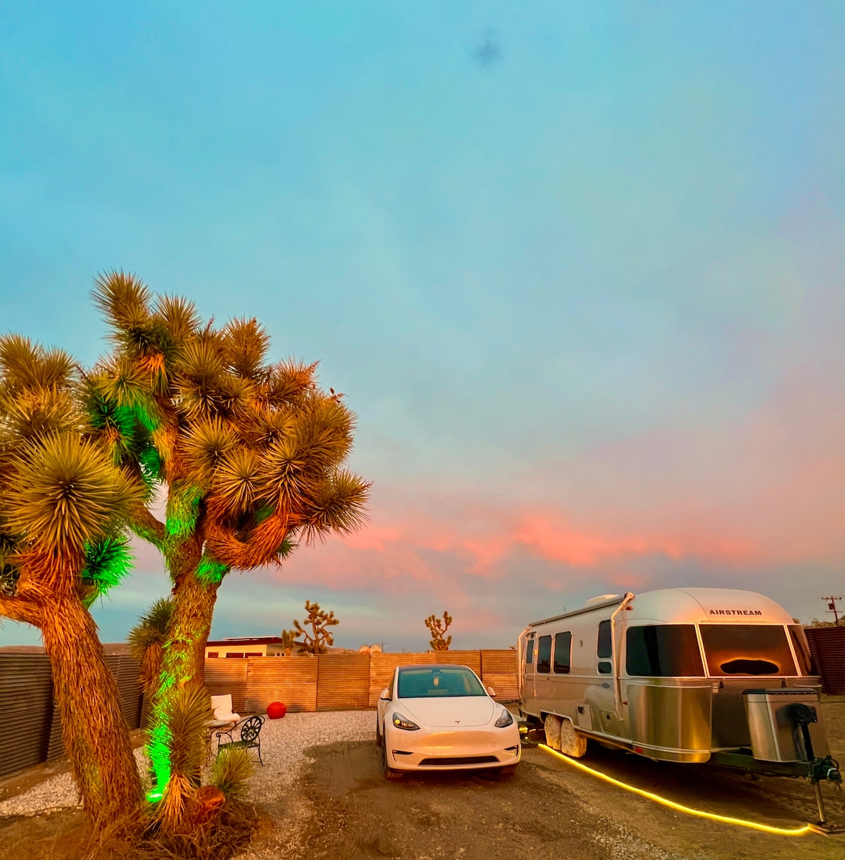 Vistas a las montañas del desierto, impresionantes amaneceres, impresionantes puestas de sol, conejos saltando por el patio, coyotes aullando por la noche. Te invitamos a disfrutar de tu desayuno en nuestra terraza de madera con impresionantes vistas, a asar con nuestra par propana incorporada, a sentarte junto a un acogedor fuego en nuestro exclusivo pozo de fuego de gas, a saltar a la refrescante bañera de vaquero para refrescarte en los días calurosos y a tumbarte cómodamente en el jacuzzi por la noche mientras contemplas las estrellas... esta puede ser tu experiencia inolvidable en Airstream.