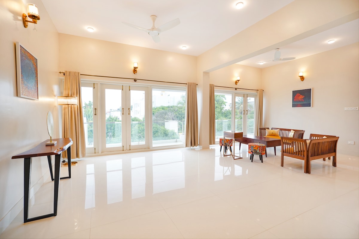 Este es un ático lujoso y espacioso situado en el centro de Bangalore y tiene 3 niveles con mucho espacio privado al aire libre. La vegetación y la luz natural que viene de la claraboya y las enormes ventanas de vidrio son lo más destacado. La casa está totalmente equipada con todas las comodidades modernas necesarias para una gran estadía. Servicio de limpieza diario, energía 24/7, ascensor, estacionamiento, cocina moderna, bar, espacio de escritorio para trabajar, Internet de alta velocidad, televisores de 65 pulgadas, barra de sonido JBL 5.1 son algunas de las comodidades estándar.