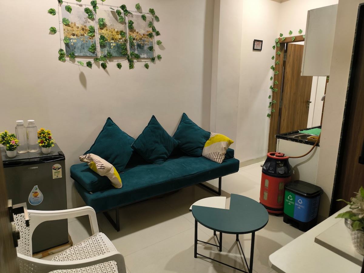 Forget your worries in this spacious and serene space. Relax in this luxurious 375 sq.ft. 1RK designed for premium comfort. Enjoy a private front balcony, fully equipped kitchen with personal RO, and a plush 7’x7’ bed with 8” memory foam mattress. Unwind on the 4-seater recliner sofa, stream on Android TV, and stay connected with free high-speed WiFi. Spacious wardrobe, big dresser, cloth hanger. Perfect for short and also long stays.