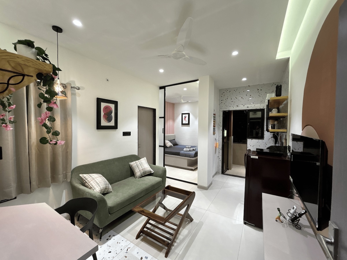 Un estudio de estilo suite de hotel con llegada autónoma en Vijay Nagar, Indore, perfecto para parejas en una estancia, mujeres solitarias viajeras y profesionales que trabajan. Tiene una cama tamaño queen, un acogedor salón, TV, escritorio plegable, Wi-Fi y un balcón. Interiores cuidadosamente diseñados y una cocina equipada, el espacio te da la comodidad de un hotel y la libertad de un hogar. A 10 minutos de Farzi Cafe & Piano Project A 10 minutos del centro comercial C21 A 25 minutos del aeropuerto y la estación Ideal para estadías cortas/largas y románticas en Indore.