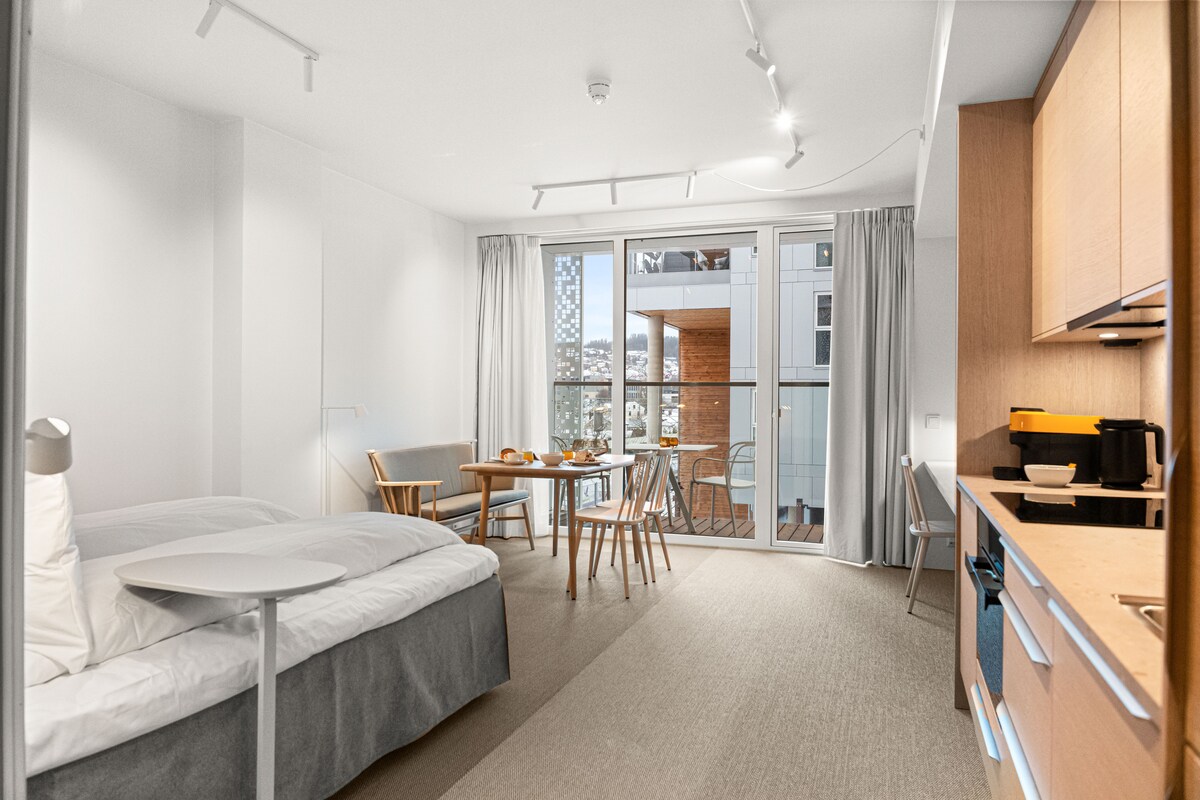 Disfruta de los generosos y cuidados estudios de 43 metros cuadrados con el tema "Østmarka" del este de Noruega. Todo para tu estadía se gestiona a través de nuestra aplicación para huéspedes, desde el check-in, el acceso a la llave de tu habitación, el soporte por chat y la información general y el check-out.