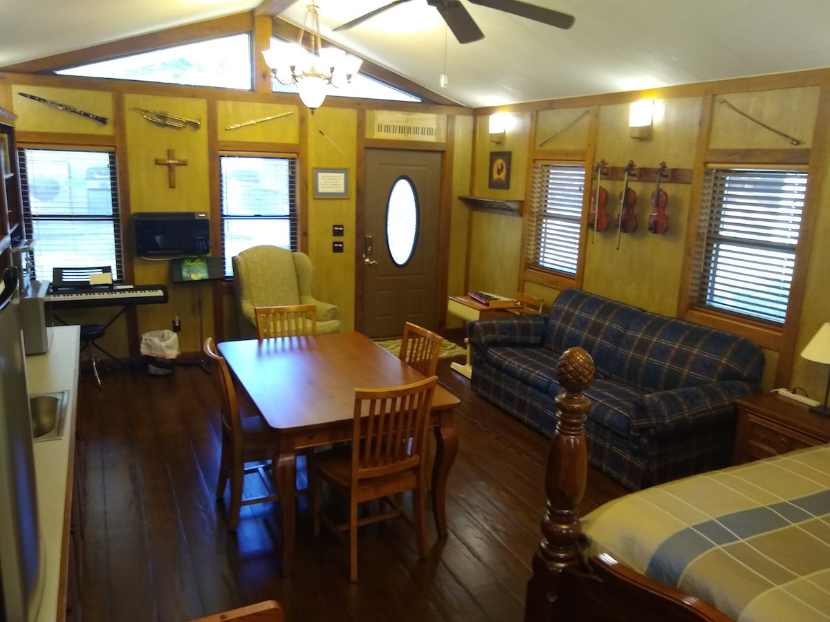 Se encuentra en la ladera de una colina con vistas a un estanque con un pequeteño bosque de pacanas como telón de fondo. Tranquilo, silencioso, convenientemente ubicado justo al lado de una carretera principal. * Prepara tus alimentos en la zona de cocina o cocina en la parrilla. * Balancéate en el porche delantero o siéntate en el porche trasero. * Camina entre los árboles, alimenta a los patos, acaricia al burro, ¡disfruta de la naturaleza! NOTA: Si necesitas algo más económico, echa un vistazo a «The Bunkhouse», misma ubicación.