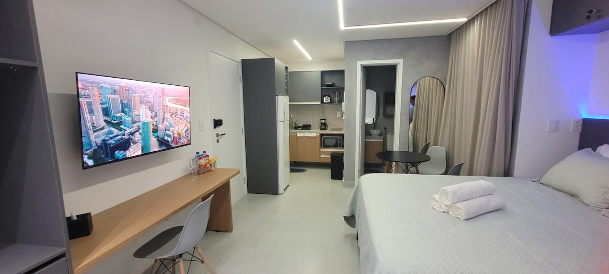 Acogedor y moderno estudio a solo 100 metros del mar, ideal para aquellos que buscan comodidad y practicidad. El espacio está bien decorado, con una cama cómoda, sofá, iluminación agradable y un ambiente integrado. Tiene una cocina equipada (encimera, microondas, nevera y utensilios), una mesa para dos personas y un baño con ducha de vidrio. Tiene aire acondicionado, TV, ropa de cama y toallas. Excelente ubicación, cerca de mercados, panaderías y restaurantes. Perfecto para parejas o viajeros que quieren relajarse en la playa.