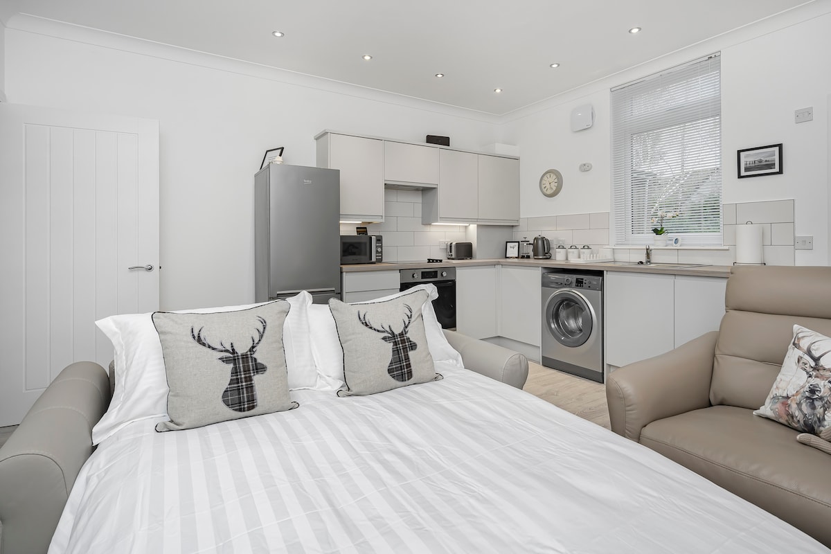 Descubre Fife en nuestro encantador apartamento de 2 dormitorios, una base perfecta para explorar la impresionante campiña y las ciudades cercanas de Edimburgo y Glasgow. Capacidad para 5 personas (cama doble y cama triple), con una amplia sala de estar, una cocina totalmente equipada y un luminoso invernadero con vistas al jardín trasero. Mantente conectado con la televisión inteligente y el wifi, y disfruta preparando tus propias comidas con servicios modernos. Nuestros pintorescos jardines y el invernadero son perfectos para relajarse y cenar en familia.