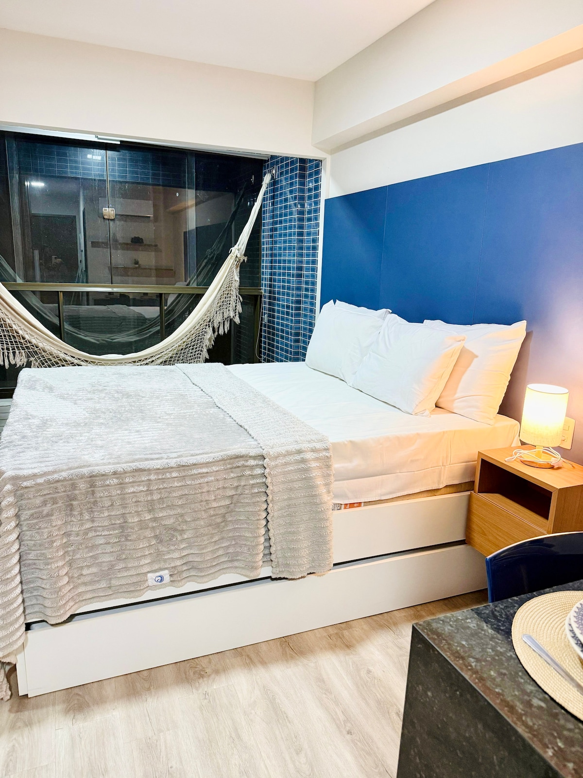 Estudio en Marulhos Suites Resort. Cama queen, dos camas, colchón extra, aire acondicionado, buena conexión a internet y smart tv. La cocina tiene nevera, gelágua, cafetera, sandwichera y otros utensilios de cocina. Acogedor apartamento frente a las piscinas. El hotel es de primera, cuenta con varias piscinas, sauna, gimnasio, canchas de fútbol y tenis, zona de juegos y recreación todos los días para los niños. Llevo unos años alquilando este y otros pisos en Muro Alto, ¡así que puedes confiar!