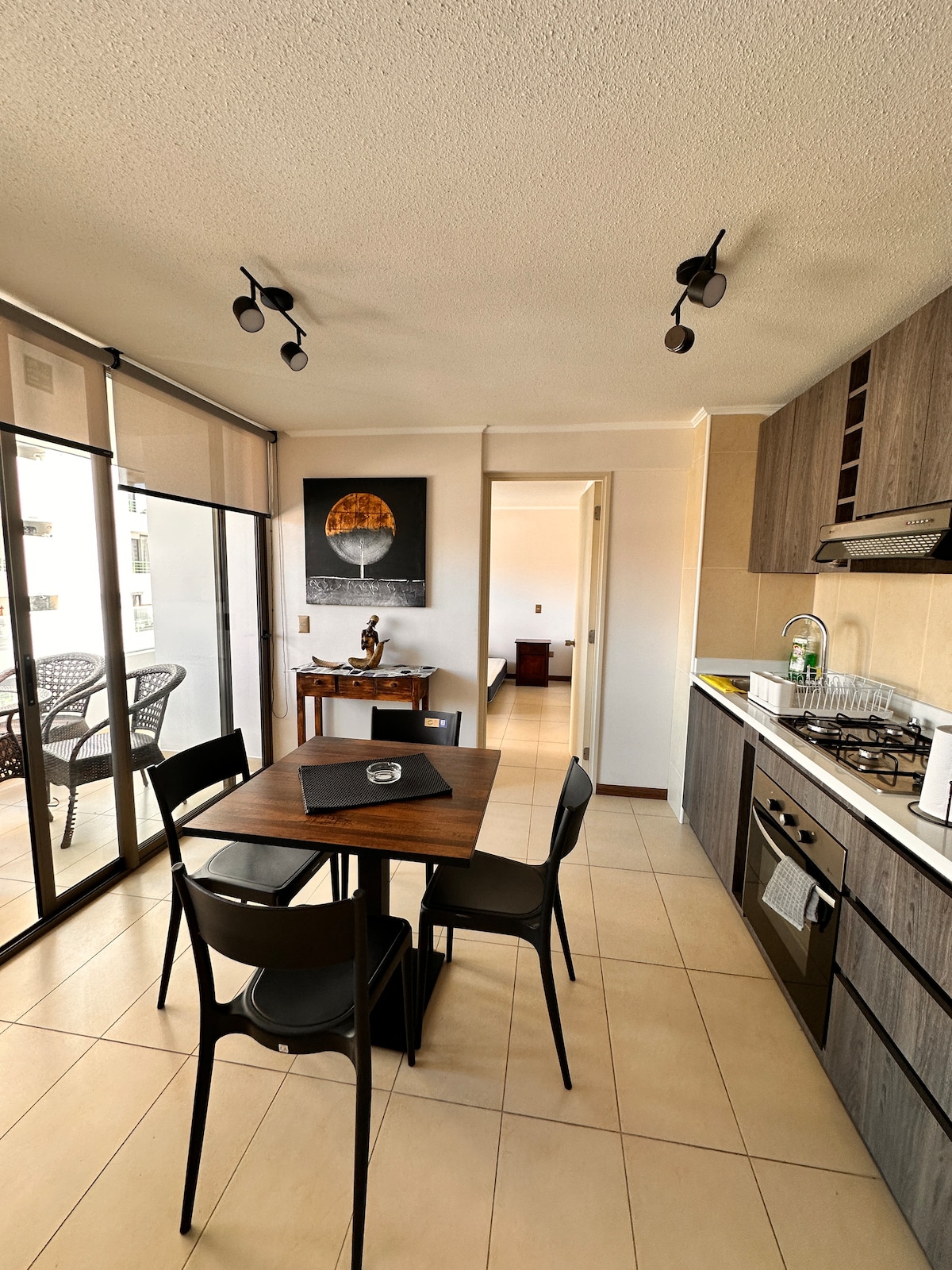 Ven a disfrutar de un hermoso atardecer frente al mar. Departamento de un dormitorio y sillón cama para 3 cómodos huéspedes. Con todo lo necesario para que se sienta como en casa. Cama tamaño King, cocina vitroceramica, lavadora, refrigerador, microondas, TV 55", wifi, terraza, piscina y estacionamiento gratuito. Inmejorable ubicación en península Cavancha, a 200 metros de playa del mismo nombre y frente a playa Brava. Cercano a supermercados, mall y a pasos de bares, pubs y cafeterías.