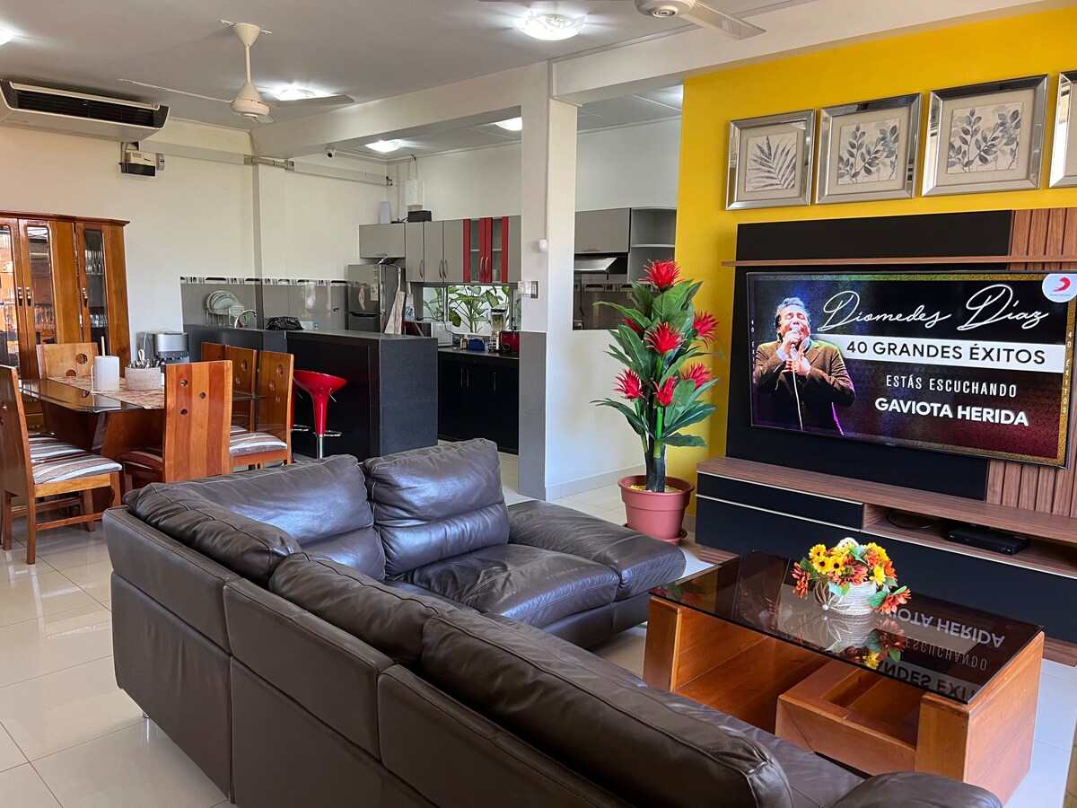 Este elegante y moderno Apartamento DORADAL 2 está ubicado en un segundo piso es ideal para viajes de trabajo, familia o amigos consta de una sala, balcón privado, comedor, cocina equipada, 5 Habitaciones amplias, con ventilador de techo, TV, escritorios de trabajo, aires acondicionados y Baños propios. Estamos a 5min. Del Puente Nanay, cerca a Hipermercado UNNO, y cerca a Av. Principales. Están prohibidas las fiestas Cuidar el apartamento como si fuera tuyo 🙏