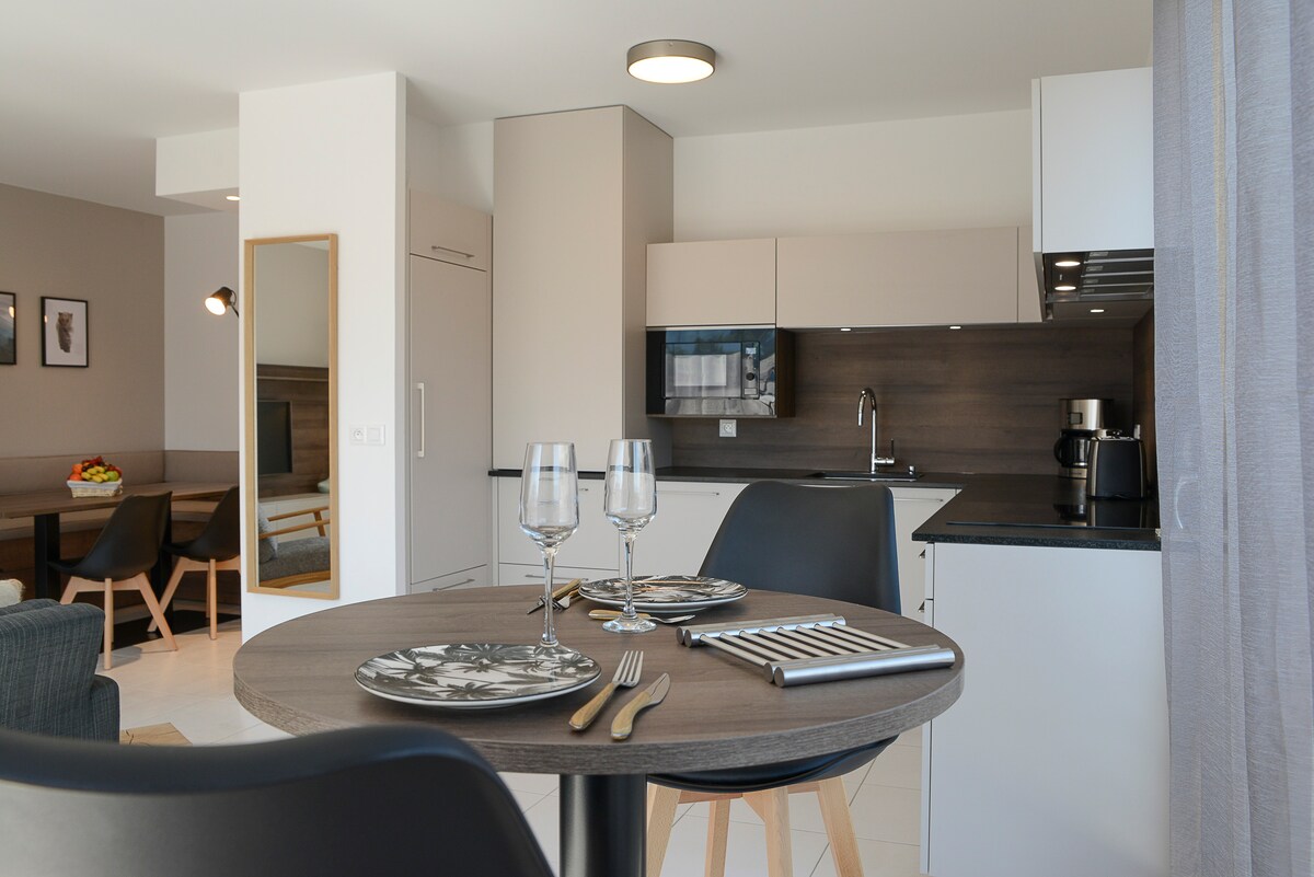 Los apartamentos de 2 habitaciones, ofrecen una hermosa superficie de 40 m² distribuida entre un dormitorio con cama de matrimonio y una sala de estar. La sala de estar se abre a una zona de cocina equipada (nevera, microondas, lavavajillas, placa de cocina, cafetera, utensilios de cocina y vajilla) con una mesa y sillas. Un sofá cama doble y un televisor de pantalla plana completan la zona de estar con wifi gratuito. Los inodoros están separados de la sala de baño equipada con ducha y bañera.