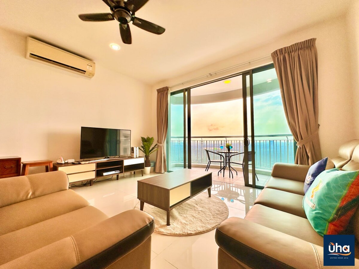 Este es un espacioso alojamiento de 2 dormitorios perfectamente apto para huéspedes de hasta 5 personas con un total de 1 cama tamaño king, 1 cama tamaño queen y 1 cama individual. Planta alta con vistas altas. 1. Cancha de baloncesto 1. Gimnasio 2. Salón de actos 3. Salón 4. Biblioteca 5. Tienda de manicura 6. Miniteatro 7. Zona de barbacoa 8. Piscina 9. Sauna 10. Jacuzzi 11. Sala de juegos (mesa de billar, sala de PS, dardos y más) 12. Lavandería 13. Minimercado - Jardín en la azotea. Los huéspedes no pueden fumar en la habitación, por favor, fuma en el balcón si es necesario.