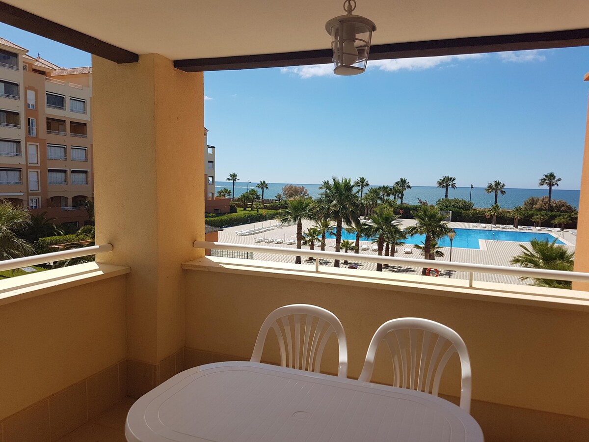 Precioso apartamento recién reformado, luminoso y muy acogedor en primera línea de playa. Dispone de un dormitorio, baño, salón comedor, cocina abierta al salón totalmente equipada, aseo, amplia terraza con vistas al mar y plaza de aparcamiento. La urbanización cuenta con zonas comunes, piscina y piscina infantil (15 junio - 15 septiembre), zona de juego para niños y pistas de pádel. Se encuentra justo al lado de una escuela de vela y cerca del puerto deportivo y el campo de golf.