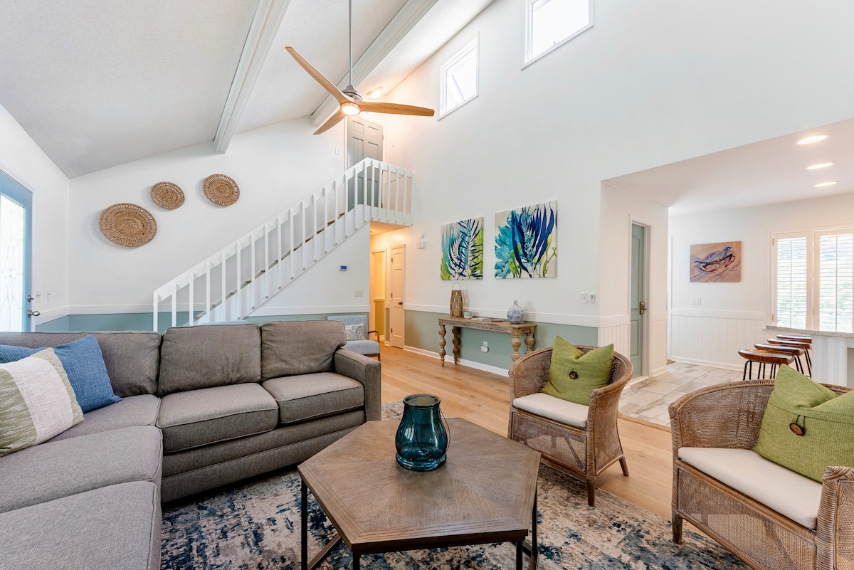 ¡Tu escapada a la playa te espera a solo 2,5 cuadras de la arena! Balancea suavemente en la cama del porche con un buen libro, sumérgete en el jacuzzi (solo en invierno) y reúnete en la enorme terraza para comer y reír. Esta casa remodelada ofrece un amplio espacio habitable, un gran porche con mosquitero y un patio cercado. Navega hasta la playa, restaurantes locales, tiendas y parques infantiles en el carrito de golf de 6 asientos incluido. Termina el día relajándote alrededor de la fogata de gas. El encanto histórico de Charleston está a solo 20 minutos.